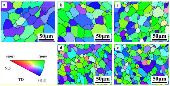 EBSD of as-extruded Mg–Al alloy (a) Mg, (b) Mg–1Al, (c) Mg–2Al, (d) Mg–3Al, (e) Mg–4Al.