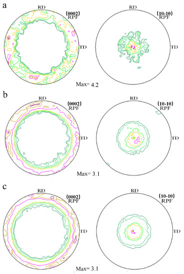Pole figure of as-extruded Mg–Al alloys measured by X-ray diffraction: (a) Mg, (b) Mg–2Al, (c) Mg–4Al.