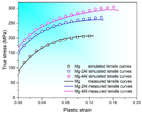 Measured and simulated flow curves for Mg–xAl (x = 0, 2, 4) alloys.