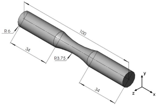 The experimental tests were performed in accordance with ASTME466 standard and under load control conditions in an Instron 8874 biaxial fatigue testing machine (Instron, Norwood, MA, USA) with a capacity of 25 kN/100 Nm. Figure 1 shows the geometry of the specimens and the respective dimensions. The specimens were fabricated using a CNC machine from extruded AISI 303 stainless steel bars; the longitudinal direction of the specimen coincides with the direction of extrusion. The specimens were polished with abrasive paper of decreasing grit size until the surface was mirror-like.
