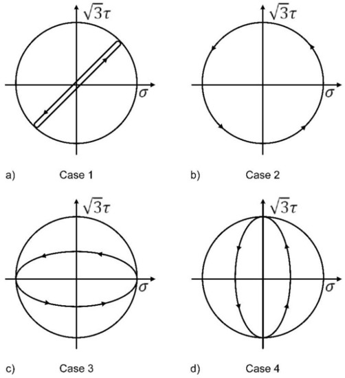 Figure 2a represents the proportional reference load, case 1, which is used for correlation with the non-proportional loads represented by cases 2 through 4. This load is normally used in the evaluation of proportional damage in structural materials. It has a ratio of shear stress to normal stress of λ = 0.57, which gives an angle of 45° in the von Mises stress space (30° if evaluated without the influence of the von Mises stress space). Case 2 (Figure 2b) is the non-proportional loading stress normally used to measure non-proportional damage. It has the same relationship between shear stresses and normal stresses as in case 1, i.e., both loadings have the same λ. In case 2, the non-proportionality results only from the phase shift between the normal and shear stresses. In case 3 (Figure 2c), the non-proportionality results from the 90° phase shift between the normal and shear stress together with the ratio of the shear stress to the normal stress equal to λ = 0.29. In this loading, the normal stresses predominate over the shear stresses. In case 4, the opposite of case 3 occurs, i.e., it has a λ = 1.15, where the shear stresses predominate over the normal stresses and the phase shift is also equal to 90°.