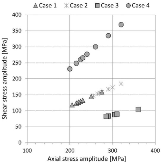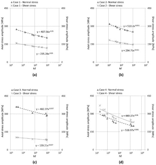 This result indicates that the relative damage between these components varies depending on the loading case, i.e., the relative damage varies depending on the relationship between the shear stress and the normal stress. Correlating case 1 (proportional reference loading—Figure 4a) with case 2 (Figure 4b), it can be seen that the SN curves of case 2 are higher than the corresponding curves of case 1. This result shows that the load of case 2 causes less damage than the proportional reference case, both loads have the same λ. In this sense, it can be concluded that the non-proportionality of case 2 causes less damage than the proportional reference, case 1. In case 2, the non-proportionality results only from the 90° phase shift between the components of the normal and shear stresses, where λ was maintained in both load channels. In cases 3 and 4, on the other hand, the non-proportionality results from the 90° phase shift between normal and shear stresses with different λ ratios.