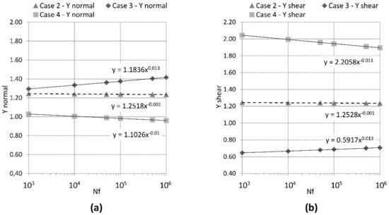 Figure 5 graphically represents the evolution of parameter Y for loading cases 2 to 4. Figure 5a plots the evolution of the Ynormal versus and Figure 5b plots the evolution of the Yshear versus , where Y values greater than 1 indicate that the non-proportional loading causes less damage than the proportional reference loading and Y values less than 1 indicate that the non-proportional loading causes more damage than the proportional reference loading.