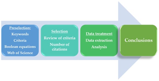 The purpose is to obtain a selection of relevant, comparable articles chosen based on pre-established criteria, and thus minimise the risk of bias in their choice or analysis by establishing protocols for all the decisions to make over the process. The Web of Science (WoS) database was defined as the search engine. This database is provided by Clarivate Analytics and allows for tracking more than 1700 million references cited in more than 159 million records [45].