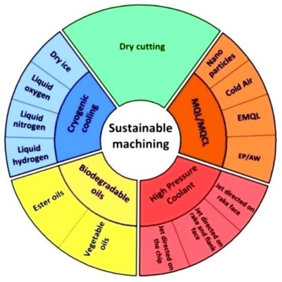 In 2020, Gupta et al. also carried out a comparative study of the trendiest sustainable cooling systems for difficult-to-machine materials: dry machining, cryogenic cooling, and the combination of cryogenic cooling with MQL. Their efficiency is analysed through several parameters; temperature, thrust force, surface roughness, and tool wear. The hybrid process provides cooling for the workpiece and the tool, and at the same time, lubricates the cutting zone, protecting the machine from vibration and wear. The research team concludes that the hybrid liquid nitrogen (LN2) + MQL coolant produces the best results of the three types of environmentally friendly coolant compared, reducing total machining costs by up to 65.84%, energy consumption by 15.89%, carbon emissions, cutting force values, surface roughness, and cutting temperature [50,73]. Figure 2 shows the different sustainable machining technologies in the form of a ring graph: dry machining, MQL, cryogenic, high-pressure coolants, and biodegradable oils.