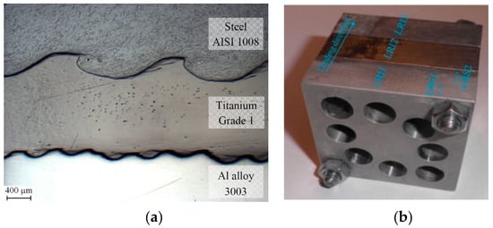 (a). Cross-section of an explosion-welded joint between a steel and an aluminium alloy with a titanium interlayer [51]; (b) Cutting Parameter Selection for Efficient and Sustainable Repair of Holes Made in Hybrid Mg–Ti–Mg Component Stacks by Dry Drilling Operations [16].