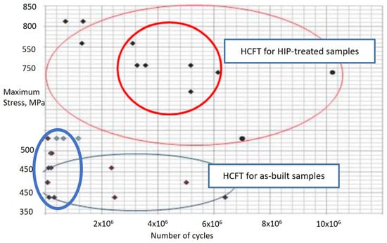 High-cycle fatigue test results obtained on specimens before and after HIP treatment, reproduced from [56], with permission from Elsevier, 2021.