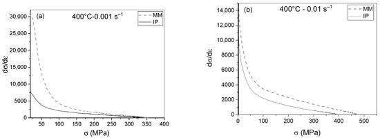 Strain hardening rate dσ/dε vs. σ of IP and MM samples at 400 °C and different strain rates. (a) 0.001 s−1; (b) 0.01 s−1; (c) 0.1 s−1.