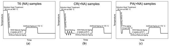 Schemes of thermo-mechanical process (a) T6 and NA processes, (b) CR and CR + NA processes and (c) PA and PA + NA processes.