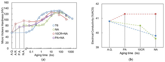 (a) Hardness change of T6, NA, 10CR + NA and PA + NA samples during artificial aging at 170 °C and (b) comparison of electrical conductivity after pre-aging, 10% cold rolling and natural aging.