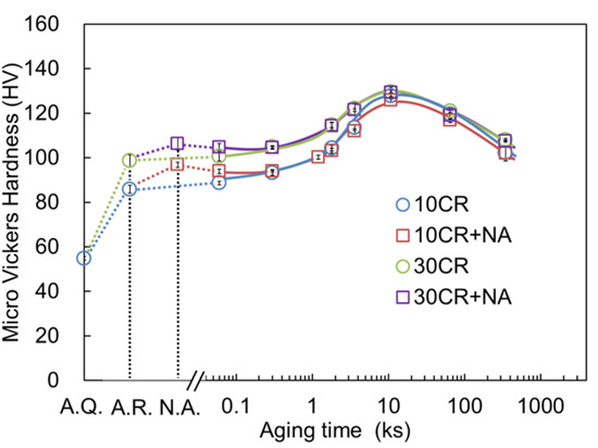 Hardness change of 10CR, 10CR + NA, 30CR and 30CR + NA samples during artificial aging at 170 °C.