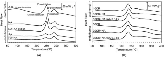 Figure 5 shows the results of the DSC analysis of samples without AA (artificial aging) or with AA for 0.3 ks. The main endothermic and exothermic peaks of the A.Q. sample are indicated in Figure 5a [1,14,19]. The peak of cluster formation disappeared from DSC curves of NA, 10CR + NA and 30CR + NA samples, indicating that cluster formation occurred during natural aging. Regarding PA samples, since the peak of cluster formation did not disappear from the DSC curve, clusters formed during pre-aging. There is no difference between the curves of PA and PA + NA. Therefore, similar to the hardness test, the results show that pre-aging prevented the effect of natural aging. The temperature of peaks of CR samples is lower than that of samples without cold rolling. It is reported that the diffusion coefficient of solute atoms affects the behavior of precipitation and dissolution [26]. In addition, it is known that the lattice defects such as dislocations and grain boundaries promote diffusion [27]. For these reasons, the peaks of DSC curves in CR samples are considered to shift to the lower temperature. The hardness of CR samples peaked in shorter time for the same reason. It is worth noting that the peak of cluster dissolution was shifted to the lower temperature side.