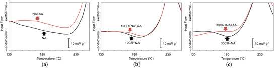 Enlarged cluster dissolution peaks of DSC curves in (a) NA and NA + AA for 0.3 ks samples, (b) 10CR + NA and 10CR + NA + AA for 0.3 ks samples and (c) 30CR + NA and 30CR + NA + AA for 0.3 ks samples.