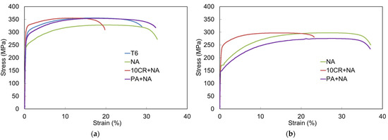 Tensile properties of (a) T6, NA, 10CR + NA and PA + NA samples aged artificially for 10.8 ks and (b) NA, 10CR + NA and PA + NA without artificial aging.