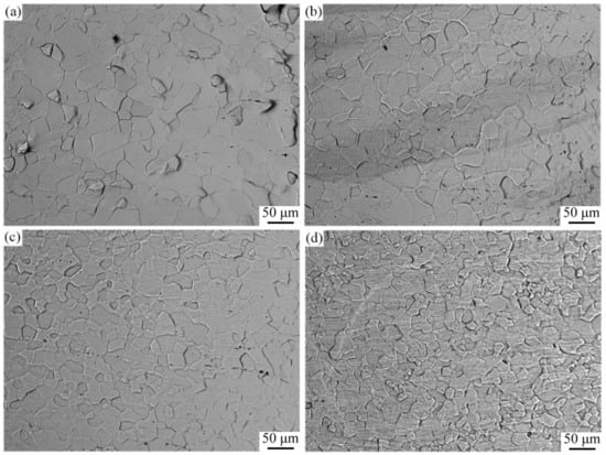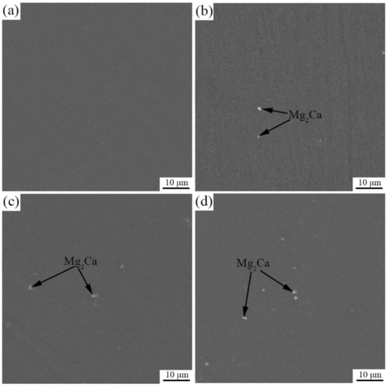 Figure 1 shows the metallographic structure of the four alloys. The grain size of the alloy gradually decreased with the increase in the Ca content. The grain size of MS alloy was about 22.3 μm, and that of MS1Ca, MS2Ca and MS4Ca alloys was refined to 20.6 ± 1.5, 19.4 ± 1.6 and 18.3 ± 2.3 μm, respectively. Figure 2 shows the microstructure of the four alloys. The Mg-0.3Sc alloy shows a single-phase structure. However, with the addition of 0.1 wt.% Ca, a small amount of Mg2Ca phase particles appeared, and the number of Mg2Ca phase particles in the alloy continued to increase with Ca content.