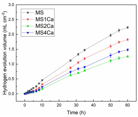 Figure 3 shows the hydrogen evolution volume–time curves of the four alloys in the NaCl solution. The hydrogen evolution volume of the three Ca-containing alloys is lower than that of MS alloy. That is, the addition of Ca decreased the hydrogen evolution rate of MS alloy. With the increase in Ca content, the hydrogen evolution volume of MS alloy firstly decreased and then increased, and the hydrogen evolution volume of MS2Ca alloy was the lowest. The corrosion rate PH (mm y−1) can be calculated from the hydrogen evolution volume VH (mL cm−2) and the immersion time t (day) by the following formula [22]: