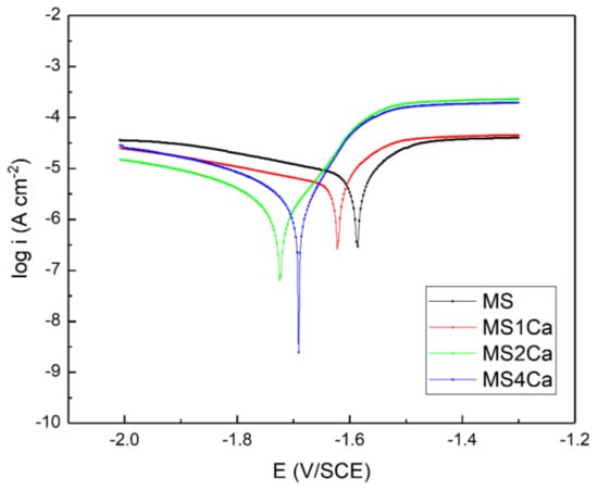 Figure 4 shows the potentiodynamic polarization curves of four alloys in the NaCl solution. The results of the icorr and Ecorr values obtained by fitting the polarization curves of the four alloys are shown in Table 2. The icorr values of MS, MS1Ca, MS2Ca and MS4Ca alloys are 3.55 × 10−6, 2.51 × 10−6, 1.05 × 10−6 and 1.58 × 10−6 A cm−2, respectively. The lower the icorr value, the lower the corrosion rate of the alloy [23,24]. The icorr value of the alloy containing Ca was lower than that of the MS alloy, which shows that the addition of Ca decreased the corrosion rate of the MS alloy. The icorr value of the alloy decreased first and then increased with the increase in Ca content. That is, MS2Ca alloy had the lowest corrosion rate.