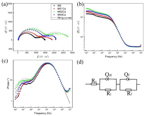 Figure 5 shows the EIS curves and the corresponding equivalent circuit diagrams of four alloys in the NaCl solution. Rs, Rf, and Rt correspond to solution resistance, corrosion product resistance, and charge transfer resistance, respectively. RL and L represent inductive resistance and inductance, respectively. Q represents a constant phase angle element [25,26,27]. The Nyquist plots of the four alloys all exhibited two capacitive reactance arcs, while the capacitive reactance arc in the high-frequency region and the low-frequency region is related to the charge transfer process and the surface corrosion product film, respectively [28]. The Nyquist diagram showed that the capacitive arc diameter of Ca-containing alloys was larger than that of the MS alloy, and the capacitive arc diameter of the alloys first increased and then decreased with the increase in Ca content. Among them, the capacitive reactance arc diameter of the MS2Ca alloy was the largest. The Bode plots of |Z|-frequency showed that the four alloys exhibited a trend that the impedance first increased and then gradually stabilized within the test frequency range. The impedance of the Ca-containing alloys was greater than that of MS alloys, and the impedance of the alloys first increased and then decreased with the increase in Ca content. Among them, the impedance of MS2Ca alloy was the largest. The Bode plots of phase angle–frequency showed that there were two peaks in the four alloys, that is, two time constants; one is the high-frequency time constant and the other is the low-frequency time constant. The high-frequency time constant is determined by the double-layer capacitor and the corresponding charge transfer resistance. The low-frequency time constant is related to the resistance of the corrosion product film [29]. Table 3 shows the fitting results of the four alloys. The (Rt + Rf) value reflects the corrosion resistance of the alloy [26]. The larger (Rt + Rf) value reflects the stronger corrosion resistance of the alloy. The (Rt + Rf) values of MS, MS1Ca, MS2Ca and MS4Ca alloys are 1434.2, 1791.3, 2756.2 and 2083.9 Ω cm2, respectively. This showed that the addition of Ca is beneficial for improving the corrosion resistance of MS alloy, and the corrosion resistance of MS2Ca is the best. The experimental results of EIS are consistent with the results of the above-mentioned hydrogen evolution and polarization curve experiments.
