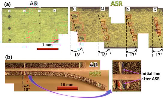 On the other hand, the equivalent strain of the ASR process is dependent on the shear and rolling strain components, as shown in Equation (3). The shear component is a function of the apparent shear angle, which can be calculated using an array of indentation marks or painted lines, as displayed in Figure 2a,b, respectively. For this purpose, four lines of several indentations were created across the sheet thickness using different loads. The indentation marks were observed using an optical microscope ZEISS Axio Vert.A1. Through the comparison of the indentation marks and the painted lines before and after deformation, an apparent shear angle of ~18° was determined (see Figure 2). Thus, the calculated shear component according to Equation (2) is 0.11, giving rise to an equivalent strain in the ASR process of 0.56 following Equation (3).