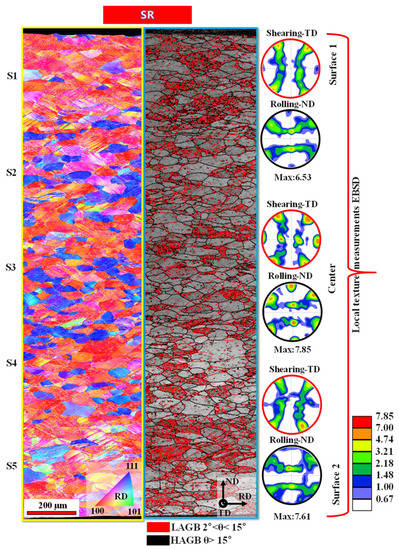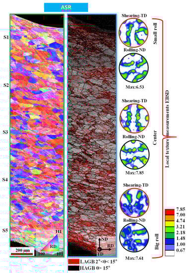 Analyzing in detail the SR microstructure across the sheet thickness, Figure 4 suggests some texture and microstructure changes indicating a more homogeneous texture and grain size. This means the strain distribution after 38% thickness reduction is evenly distributed throughout the thickness of the sheet. For that reason, a well-defined rolling texture is observed in all the areas. The difference is a lower texture intensity in the surface vicinities than in the middle zone. Conversely, the material processed by ASR exhibits the largest microstructure and texture changes at S1 and S5 locations, i.e., near the small and big rolls, as the grain size and morphology are both significantly affected, as indicated in Figure 5. From this figure, it is evident that the shear effect of the ASR process is due to the velocity gradient between the rolls creating elongated and shear-strained grains concerning the rolling direction (RD). In addition, the shear effect also creates more randomly oriented grains near the surfaces, as the pole figures indicate lower intensities with no well-defined rolling texture components. Moreover, the shear strain also affects the center zone, generating a counterclockwise texture twist around the ND.