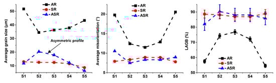 For the five investigated locations (S1 to S5), Figure 6 indicates the average misorientation, average grain size, and LAGB fractions before and after rolling processes. Compared to the AR specimen, it is evident that the average misorientation, average grain size, and HAGB fractions were reduced in the SR and ASR processed specimens. After SR, the different microstructural characteristics seem to be homogeneous in all the analyzed zones across the sheet thickness. For example, the grain size of the SR specimen slightly changed throughout the sheet’s thickness, having values of 12.9 μm, 12.5 μm, 12.4 μm, 11.5 μm, and 8.6 μm for the edges S1 through S5 (standard deviation of 1.7 µm), respectively. The ASR specimen achieves the opposite result, where all the microstructure characteristics show heterogeneous and asymmetric behavior. Due to the velocity gradient between the rolls, the ASR specimen shows quite the opposite, with average grain size values of 11.7 μm, 20.3 μm, 17.8 μm, 12.2 μm, and 6.3 μm at S1, S2, S3, S4, and S5 (standard deviation of 5.5 µm), respectively. Therefore, it may be deduced that the ASR sample has a heterogeneous grain size with the lowest values close to the regions S1 and S5. In addition, the grain size tends to decrease towards the S5 area from the area S2, confirming an asymmetric profile (see Figure 6).