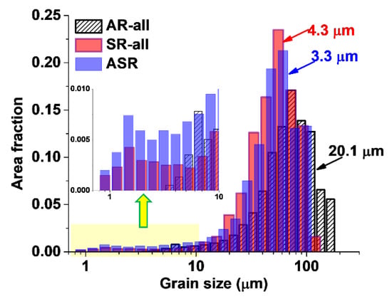 When it comes to the overall average grain size behavior, Figure 7 indicates a grain size reduction from 20 µm to 4.4 µm and 3.3 µm after SR and ASR processing, respectively (the average values were calculated given the number of grains instead their area weight). Although the grain size distributions do not reflect such differences between the AR material and the rolled ones, this is explained by the number of grains smaller than 10 µm in each material, as suggested by the inset coming from the yellow shading in Figure 7. This behavior corroborates the faster grain fragmentation, mainly around the sheet surfaces, due to the more intense and heterogeneous shearing strain in the ASR than in the SR process.