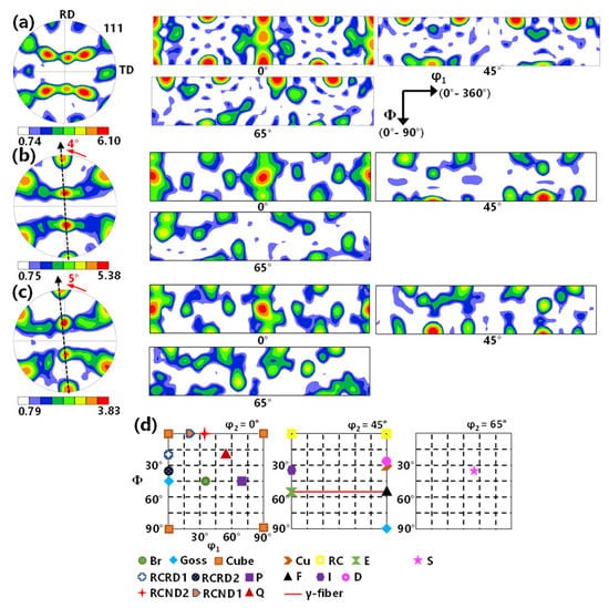 In terms of overall texture, Figure 8 represents the alloy’s texture as pole figures (PFs) and orientation distribution functions (ODFs). Thus, Figure 8a indicates that the AR sheet texture is dominated by Cube and Goss texture components, as corroborated by the ODF and the ideal orientation representation in Figure 8d. These components have been associated with the recrystallization phenomena in Al alloys processed by rolling [24,39]. On the other hand, when the sheet was rolled symmetrically and asymmetrically, a similar overall behavior was observed, as shown in Figure 8b,c. It is worth mentioning that both processes reduce the Cube component intensity while the Goss component is strengthened. Another visible observation after rolling, either by SR or ASR, is the counterclockwise twist around the ND. This could be related to the multiple rolling passes to reach the 38% thickness reduction. At first glance, the overall texture of the processed sheets seems to be dominated by the components far from the surfaces (i.e., texture in the middle zone), especially for the ASR process. However, it is important to consider that the overall texture intensity decreases more with the ASR processing than with the SR concerning the AR material, as indicated in Figure 8. This behavior can be a consequence of the texture randomization near the surfaces by the ASR process, as indicated in Figure 5.