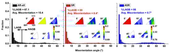 Regarding the grain boundary nature, Figure 9 compares the misorientation angle distributions and the misorientation axes for all the analyzed conditions. This figure highlights a higher fraction of LAGBs after SR and ASR processing than in the AR material. This behavior is also indicative of grain fragmentation induced by plastic deformation. Thus, the original grains are subdivided by grouping dislocations that give rise to dislocations walls which can evolve into LAGBs or HAGBs depending on the plastic strain magnitude. Several researchers have described this grain fragmentation mechanism as a recrystallization phenomenon at low temperatures without nucleation called continuous dynamic recrystallization [40,41]. In this context, the misorientation axis distribution suggests that grain boundaries follow the same path in both processes. The difference comes from the rate at which the change occurs. Accordingly, the ASR process produces a faster change from LAGBs to HAGBs than the SR. The previous affirmation is corroborated by the larger average misorientation and the lower grain boundary texture intensity shown in the misorientation axis distribution in the ASR process.