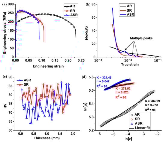 The engineering stress–strain curves of the tensile tests of the AR, SR, and ASR specimens are depicted in Figure 10a. As observed in this figure, the ASR process slightly enhances the yield stress (YS) of the rolled specimen compared to the SR one. The YS increased from 192.2 MPa for the AR specimen to 248 MPa and 250.7 MPa after SR and ASR processing, respectively. Additionally, the ultimate tensile stress (UTS) increased from 243.5 MPa to 258.1 MPa and 265.1 MPa, correspondingly. However, the ductility decreases after the SR and ASR processes concerning the AR specimen. According to Zhu et al. [42], ductility in metallic materials is controlled by microstructure characteristics such as grain size and dislocation density. Therefore, high dislocation densities in homogeneous smaller grain sizes can affect the strain hardening capacity, reducing material ductility. This is due to the shorter mean free path for dislocation motion that also leads to faster dislocation annihilation. The above observations demonstrate that the SR and ASR processes increase the tensile strength but at the expense of ductility.