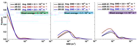 The grain fragmentation after rolling processing can be correlated with the GND evolution. Figure 11 represents the GND distributions in regions S1, S3, and S5 for all the materials. This figure shows that the dislocation density of rolled materials increases by one order of magnitude after plastic deformation concerning the AR material. This observation results from the amount of LAGBs and the lower average misorientation that indicates more distortions inside the original grains. Therefore, the GNDs appear to compensate for the curvature of the grains creating new grain boundaries.
