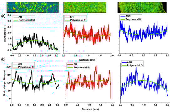 As shown in Figure 12a,b, the kernel average misorientation (KAM) and the grain size profiles indicate heterogeneous behaviors across the sheet thickness. Figure 12a demonstrates that after rolling, both SR and ASR produce more considerable misorientation differences around the surfaces than in the middle zone. In addition, the grain size profiles indicate that ASR gives rise to a curved profile with the smallest grains near the surfaces, while SR follows a flatter profile, as indicated in Figure 12b. From the KAM and grain size profiles, the heterogeneity of the ASR processed sheet covers almost 500 µm (~250 µm for each side). However, this heterogeneity degree is not enough to overcome the strength–ductility trade-off because the dimensional differences between the regions that make up the sheet heterogeneity are not that great. Ma et al. [48] suggest the combination of coarse with nanometric grains to reach a well-defined microstructure heterogeneity with no homogeneous plastic deformation. Although the grain size heterogeneity produced by ASR is not enough to keep the alloy ductility, it can influence the plastic anisotropy due to the marked texture changes around the sheet surfaces, as shown in Figure 4 and Figure 5.