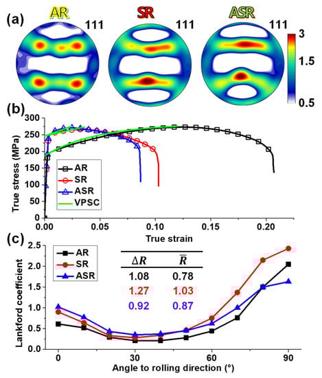 To evaluate the plastic anisotropy, the VPSC model was adjusted by considering the overall and local texture measurements. Therefore, a predicted anisotropy for all the sheets and the different zones was obtained. Figure 13a demonstrates a good texture prediction for the SR and ASR process after 38% thickness reduction concerning the experimental pole figures indicated in Figure 8. Moreover, Figure 13b indicates a good fit of the predicted true stress–strain curves with the experimental ones. The plastic anisotropy was quantified using the normal anisotropy () and the planar anisotropy () parameters defined as follows [49]: