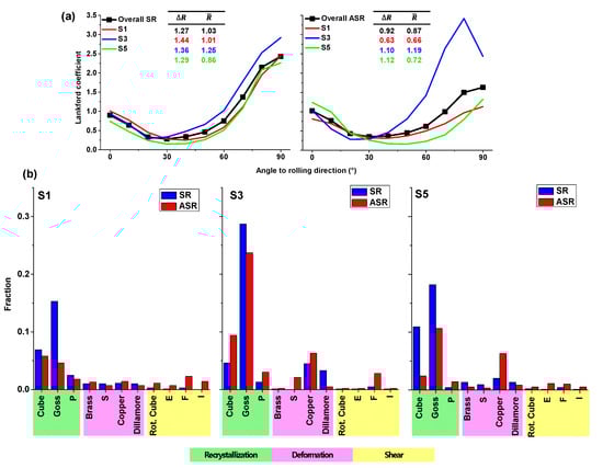 The texture component distribution in the sheet explains the lower scatter of the Lankford coefficients after ASR processing. Figure 14b demonstrates that in regions S1, S3, and S5, the fraction of shearing components is higher for the ASR than for the SR material. The same behavior is observed for the deformation components, with the copper component being the most intense. It is also important to mention that after SR and ASR, the material texture changes from a dominant Cube component to the Goss orientation. The middle zone (i.e., S3), where the fraction of the recrystallization components is the highest, allows this observation to be noticed more clearly.