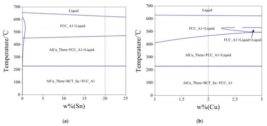 The equilibrium phase diagram of the AlSn20Cu alloy calculated by PANDAT: (a) the phase transition with increasing Sn content in Al–2Cu matrix, (b) the phase transition with increasing Cu content in Al–20Sn matrix.