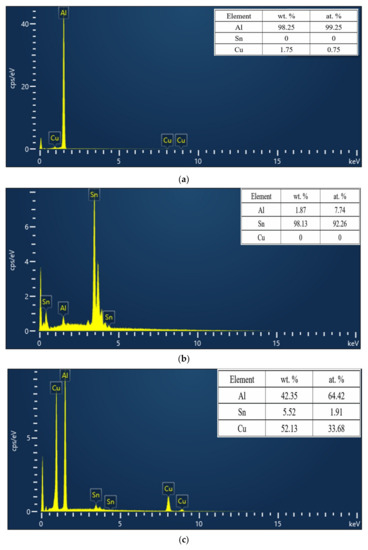 EDS analysis of semi-continuously cast AlSnCu alloy: the order corresponds to the points marked in Figure 4b. (a) point A, (b) point B, (c) point C.