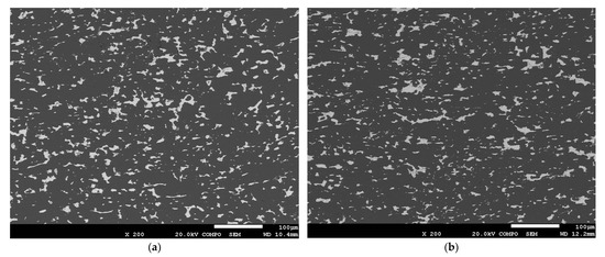 The final microstructures of the AlSn20Cu alloys prepared using the three different processes are shown in Figure 4, Figure 9, Figure 11, Figure 14 and Figure 18. The same raw material is used in each process. The morphology of the Sn phase is quantitatively analyzed using image processing software, as shown in Table 1. The area fraction, particle size, and number density of tin-phase particles are analyzed, and the data in Table 1 are converted from pixel data.