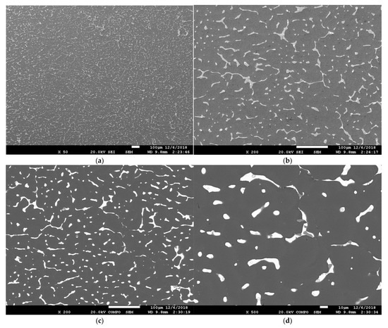 SEM images of a billet produced using semi-solid die casting: (a,b) secondary electron imaging, (c,d) backscattered electron imaging.