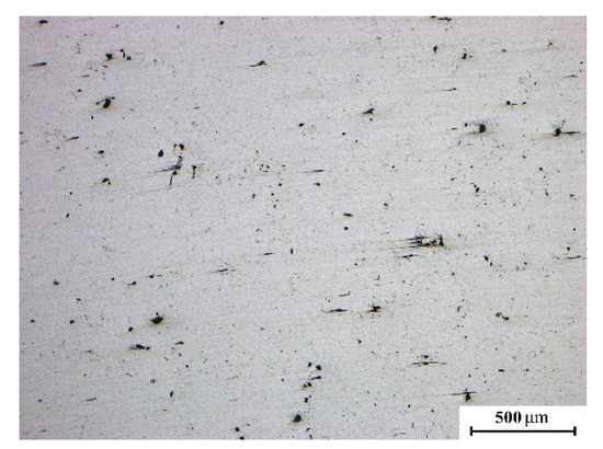 The alloy ingot with an outer contour size of Φ190 mm × 500 mm prepared by spray forming is shown in Figure 12. Figure 13 shows a metallographic photo of the ingot produced using spray forming. It can be observed that, compared with the other ingot making processes, the number of defects in the ingot prepared by spray forming is larger, but the defect size is significantly smaller than that of ordinary casting. Figure 14 shows an SEM image of the ingot produced using spray forming.