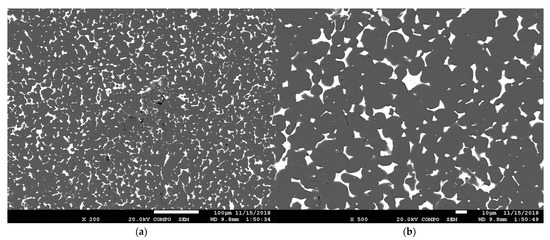 SEM images of a spray-formed ingot after densification. (a) magnified 100 times, (b) magnified 200 times.