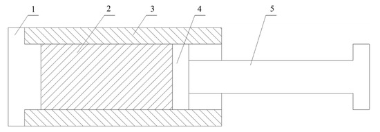 Schematic diagram showing the densification process of blocking hot extrusion. 1: Blocking extrusion die, 2: billet, 3: extrusion cylinder, 4: extrusion pad, and 5: extrusion rod.