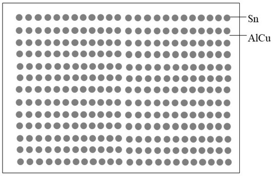 Cu exists in the AlSn20Cu alloy aluminum matrix as a solid solution element, and Sn is mostly insoluble in aluminum. The discontinuous distribution of the tin phase in the grain boundaries of the aluminum matrix results in poor plasticity of the alloy. As mentioned in Section 1, aluminum–tin antifriction alloys generally require a tin-phase morphology that is in the form of nearly equilateral particles. Because of the weak deformation capacity of the alloy, the acquisition of nearly uniformly distributed equilateral granular tin phase is the main focus of this study. According to engineering practice experience and the literature [5,18], the ideal distribution of the tin phase in an AlSn20Cu alloy in terms of bearing preparation is shown in Figure 19. The tin phase is uniformly distributed in a spherical shape in a matrix that comprises the aluminum alloy.