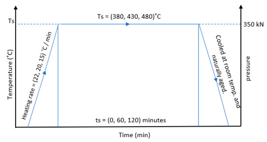 The cleaned AA7075 chips were filled and compacted into a dog-bone closed die. The aluminum recycling process was performed using a laboratory hot press forging (HPF) machine, UTHM, Malaysia. The hot press forging (HPF) process, as shown in Figure 1, was executed at a constant pressure of 35 tonnes, with a four-times pre-compacting cycle. Figure 2 portrays the process diagram of DR-HPF. The selected operating temperatures in this process are 380, 430, and 480 °C, and the holding times are 0, 60, and 120 min. The recommended range of forging temperatures for AA7075, based on the ASM handbook committee, volume 14A is between 380 and 440 °C [60]. However, Yusuf et al. (2013) suggested that the forging temperature must be chosen to fall between the solidus and recrystallization temperatures [58]. It has been proposed that the recrystallization temperature for AA7075 should be between 430 and 480 °C [61], while the solidus temperature started at 477 °C (ASM Material Data Sheet). Meanwhile, the most commonly selected holding time from the previous studies for AA7075 is 60 min [62,63,64,65,66,67]. As a result, the temperature and holding time chosen in this study are based on the previously indicated recommended data. Recycled specimens with different parameter settings are presented in Table 2. The recycled samples after the DR-HPF process are denoted as T1- temper and will be compared with theoretical ASM AA7075-O, to observe the potential properties of the secondary material.