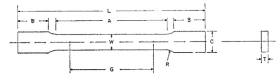 Based on in Figure 3, A refers to the length of the reduced section which is 32 mm, B refers to the length of the grip section which is 30 mm, C refers to the approximate width of the grip section which is 10 mm, L refers to the overall length which is 100 mm, W refers to the width which is 6 mm, G refers to the gauge length which is 25 mm, T refers to the thickness which is less than 6 mm and R refers to the radius of the fillet which is 6 mm.