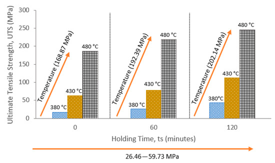 As seen in Figure 4, the inclination trend for UTS, depicted at a maximum duration of 120 min from 43.48 MPa (380 °C), surged up to 245.62 MPa (480 °C). At zero holding time, the UTS rose with increasing working temperatures, ranging from 17.02 MPa (380 °C) to 185.89 MPa (480 °C). The operating temperature has a substantial impact on the HPF process by demonstrating that, at a constant holding time, increasing the operating temperature from 380 °C to 480 °C increased the UTS value from 168.87 MPa to 202.14 MPa. In brief, the working temperature has the greatest influence in terms of enhancing the mechanical properties. Stress in a deformation process has a significant effect on forgeability [70]. The forgeability of metals increases with rising temperature as the grain size decreases, resulting in excellent tensile strength. Besides this, the solubility increases with temperature; therefore, working at a lower temperature will result in poorer properties [71]. Moreover, solid solution strengthening is likely to have a significant influence at high temperatures [32]. According to Sajadifar, the optimal temperature parameter for AA7075 aluminum alloy is 480 °C. The formation of detrimental intermetallic particles occurred when the temperature exceeded 480 °C [72]. Meng agreed that the increase in UTS was a result of the increase in heating temperature, stating that solute atoms were dissolved in the aluminum matrix during solutionizing and remained in a metastable state [69]. A similar trend has been observed when comparing the influence of holding time to UTS. At the temperature of 380 °C, the UTS value climbed from 17.20 MPa (0 min) to 43.48 MPa (120 min). At a maximum temperature of 480 °C, the UTS value rises from 185.89 (0 min) to 245.62 (120 min).