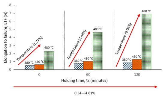 As shown in Figure 5, the ETF exhibited a linear trend with increasing temperature, which is very similar to the UTS trend. At the maximum holding time (120 min), the ETF value for 380 °C was 0.87% and elevated up to 6.91 at 480 °C. At zero holding time, the ETF values rose with rising temperature from 0.53% (380 °C) to 2.30% (480 °C). The operating temperature showed a substantial influence on the HPF process by showing that the value of ETF rose from 1.77% to 6.04% when the temperature went from 380 °C to 480 °C at a constant holding time. Meanwhile, at the minimum temperature of 380 °C, the value of ETF went up from 0.53% (0 min) to 0.87% (120 min), while at the maximum operating temperature of 480 °C, the ETF value went up from 2.30% (0 min) to 6.91% (120 min).