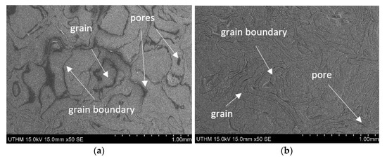 Figure 6 and Table 5 show the microstructure and the grain size at the minimum S1 (380 °C/0 min) and maximum S9 (480 °C/120 min) parameters of the recycled AA7075 specimen, respectively. The images of the specimens were magnified at 50×. The images show the grain, grain boundary, and pores.