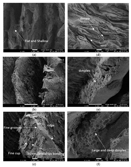 Figure 7 shows an observation of the effect of minimum (380 °C/0 min) and maximum (480 °C/120 min) parameters on the fractured surface. When the metallic aluminum is broken, the breakage will vary, depending on the parameter setting of the HPF process. Figure 7a–c represents the fractured surfaces at minimum parameters, while Figure 7d–f represents the fractured surfaces at maximum parameters at different magnifications. At the minimum parameter, the fractured surface is revealed as shallow and flat, with no dimples at all. The image shows that fracture occurs along the crystallographic plane, known as the cleavage plane, with no plastic deformation where the normal stress is maximized [32]. At high magnification, as seen in Figure 7c, these flat areas exhibit fine cups and ridges. The metallic bonding between chips is also not fully formed, as a result of insufficient temperature and holding time. Low temperature leads to little or no oxidation and precision dimensioning, but it increases flow stress and decreases ductility, which promotes cracking [70]. This supports the result of the ETF value, which is as low as 0.53%.