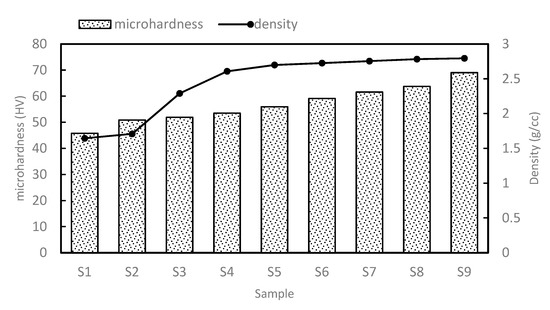 Figure 8 represent the overall density graph and microhardness graph at different parameters. As seen in Figure 8, the density and microhardness values increased with the increasing operating temperature and time. The minimum and maximum values of microhardness are 45.79 HV and 69.02 HV, respectively. Meanwhile, the minimum and maximum values of density were 1.645 g/cm3 and 2.795 g/cm3, respectively.