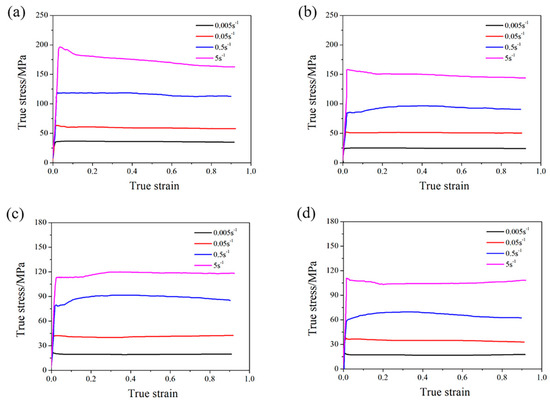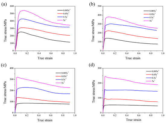 Figure 1. True stress–strain curves of Ti555211 alloy undergoing plastic deformation in the dua-phase region: (a) 700 °C; (b) 750 °C; (c) 800 °C; (d) 850 °C.