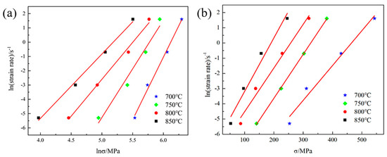 Figure 3. Solving material constants n and α of dual-phase Ti555211 alloy by means of linear fitting: (a) ln ε ˙ ln σ ; (b) ln ε ˙ σ .